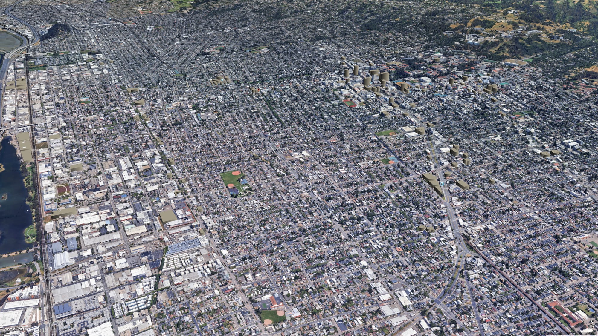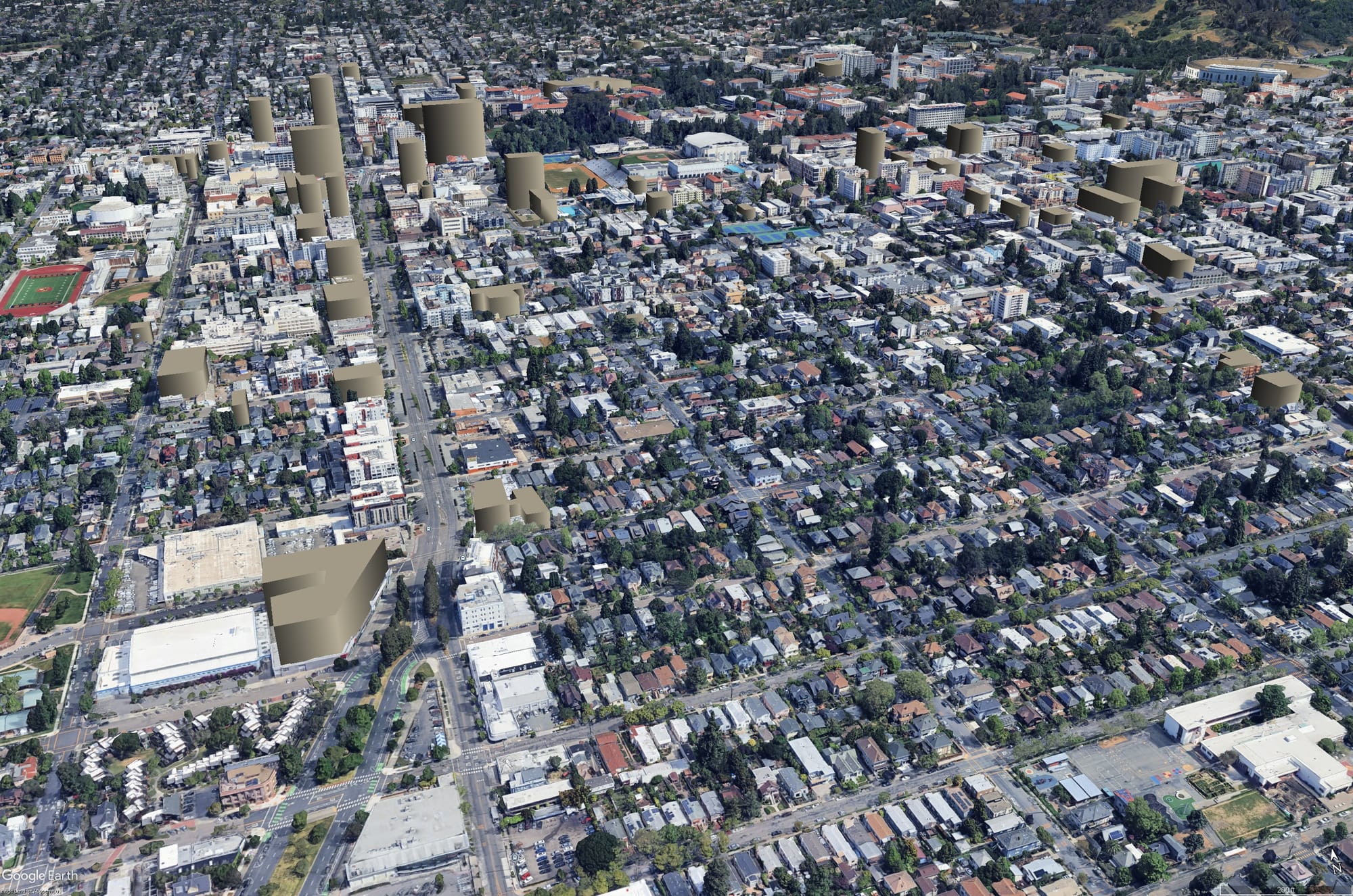 Image descriptions: 1) a Google Earth view of downtown Berkeley & Southside in its current form, with a mix of single-family homes, duplexes, and mid-rises plus a few under-200 foot towers downtown; 2) the same image with renderings of the proposed developments, including plenty of mid-rises and a few towers, with several over 200 feet and one over 300 feet; 3) a zoomed out image of the whole city with proposed developments, showing that developments are concentrated on a few neighborhoods and commercial corridors, with most of the low-slung city completely untouched